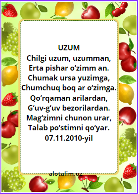 Mevalar va sabzavotlar haqidagi she’rlar bolalar tarbiyasida muhim o‘rin tutadi, chunki ular orqali sog‘lom ovqatlanish, vitaminlarga boy mevalar va foydali sabzavotlar haqida qiziqarli va esda qolarli tarzda o‘rganish mumkin. Ushbu maqolada mevalar va sabzavotlar haqida she’rlar, bolalar uchun she’rlar, tarbiyaviy she’rlar hamda bog‘cha va maktab o‘quvchilari uchun eng chiroyli namunalarni topasiz. 🌿🍎